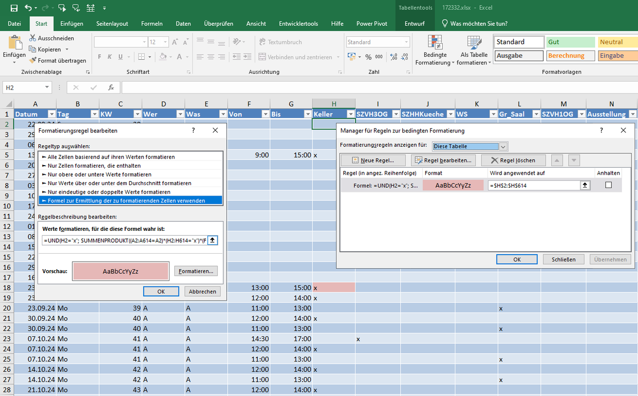 Was mir ChatGPT vorschlägt ist u.a. folgende Regel, die ich für jeden einzelnen Raum umgewandelt eingeben soll, also 7 Regeln: =UND($H2="x"; SUMMENPRODUKT(($A$2:$A$614=$A2)*($H$2:$H614="x")*($F$2:$F$614$G2)*($G$2:$G$614>$F2))>1)