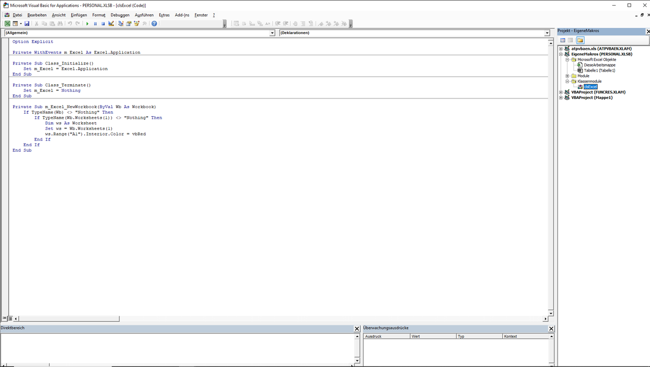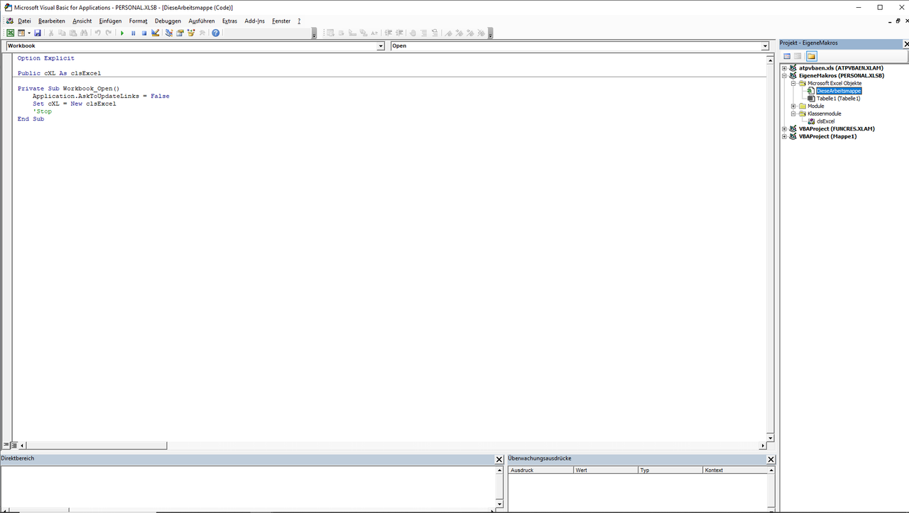 Ich möchte gerne mittels Auto Open, dass immer wenn ich Excel starte, eine ( neue oder existierende " Excel Datei öffne,) dass Code im Auto Open automatisch ausgeführt wird. Zbs. soll jedesmal wenn man excel startet 3 Spalten zugefügt werden. Ich bekomme es nicht hin und würde mich über einen Rat sehr freuen, viele Grüße Michael