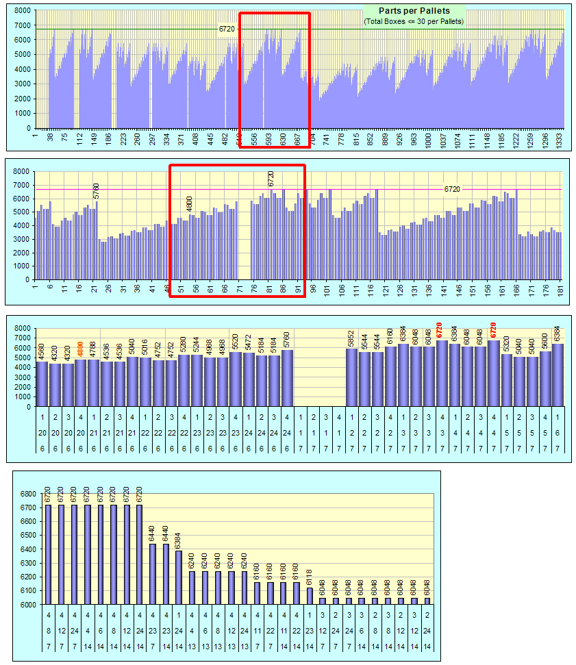 Das Problem habe ich bereits identifiziert. Die Ergebnisse der Divisionen werden abgerundet auf ganze Zahlen und dann erst für die Berechnung der Zielzelle weiterverwendet. Wenn ich richtig informiert bin, dann "denkt" der Solver wahrscheinlich an einer bestimmten Stelle, dass er das Maximum bereits erreicht hat, weil sich das Endergebniss so lange nicht ändert.