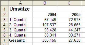 Erweitern wir nun die Tabelle um das Jahr 2005. Auch hier gab es quartalsmäßig vier Umsatzzahlen.